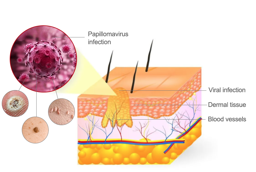Warts are caused by viral infections of the skin. The most common warts usually appear on the fingers, hands, and feet. Warts may also appear on other parts of the body, including the face, knees, and elbows. Warts usually have a rough, bumpy surface and may be round or oval in shape. They may be painful or uncomfortable, especially if they are on a weight-bearing part of the body.
