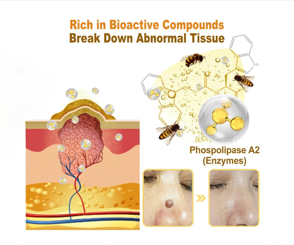 Bee venom contains a variety of bioactive compounds, including melittin, melittin and adolapine, which have been scientifically proven to be effective in treating skin tags or warts, and among its many enzymes, phospholipase A2 stands out for its ability to break down abnormal tissue, simplifying the removal process of skin tags or warts.